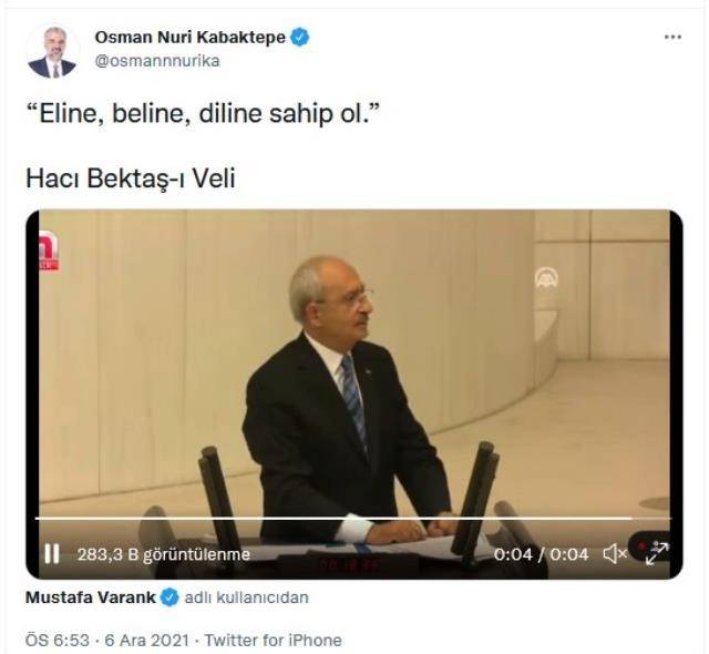 AK Parti İstanbul İl Başkanı Osman Nuri Kabaktepe Kılıçdaroğlu'nun hareketine Hacı Bektaşi Veli'nin sözünü hatırlatarak tepki gösterdi.