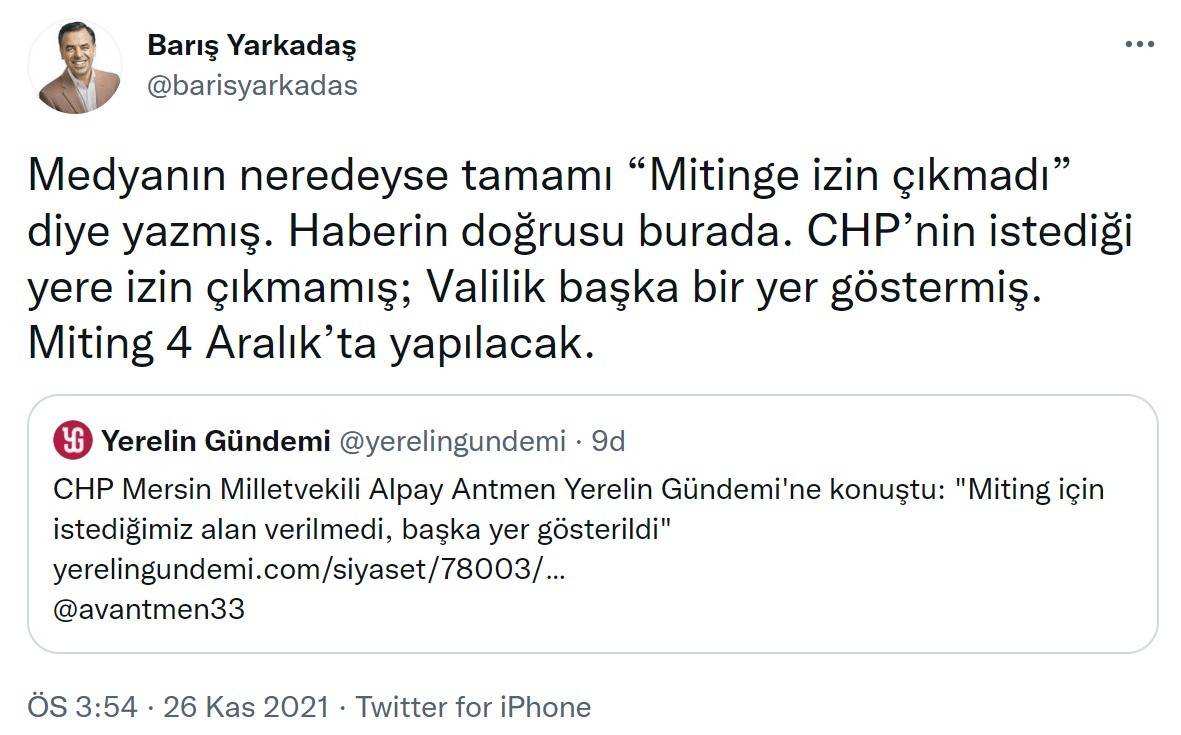 Sadece CHP'nin istediği yere izin çıkmadığını, Mersin Valiliği'nin miting için başka bir alan gösterdiğini ifade eden Yarkadaş paylaşımında şunları kaydetti: