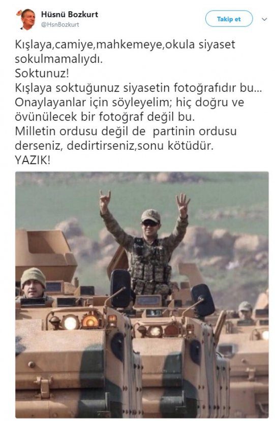 CHP Konya Milletvekili Hüsnü Bozkurt, rabia ve bozkurt yapan asker fotoğrafı hakkında,"Onaylayanlar için söyleyelim, hiç doğru ve övünülecek bir fotoğraf değil bu." dedi.
