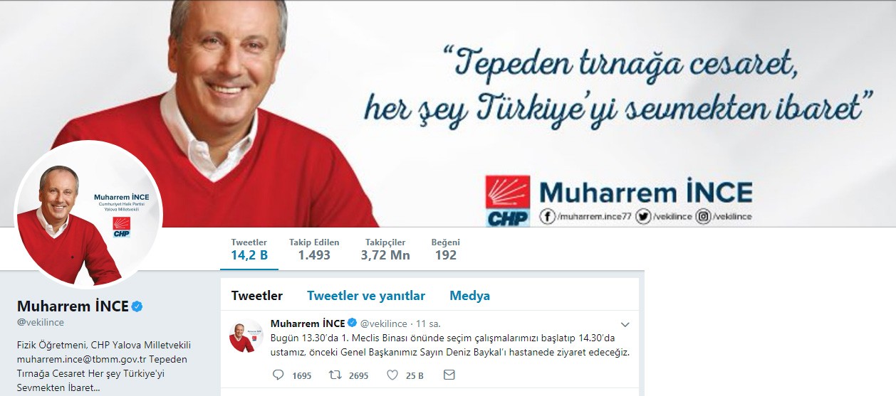 Cumhurbaşkanı adayı olarak açıklanan Muharrem İnce'nin hala Twitter hesabında herhangi bir değişiklik yapmaması dikkatlerden kaçmadı. CHP'nin seçimlere ne kadar hazır olduğu böylece ortaya çıktı.