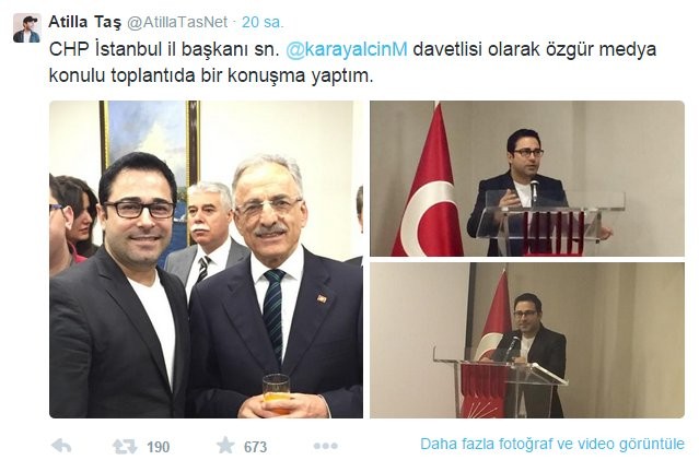 Programda "özgür medya"yı anlatan Taş, Twitter'dan, "CHP İstanbul il başkanı sn. @karayalcinM davetlisi olarak özgür medya konulu toplantıda bir konuşma yaptım"notunu paylaştı.