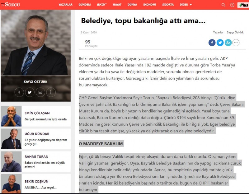 Öztürk bugün (3 Kasım 2020) yayınlanan yazısında kabahatin bakanlıkta değil belediyelerde olduğunu detaylı bir şekilde açıklayarak ortaya koydu.