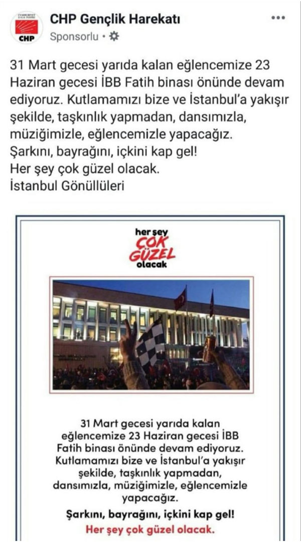 “31 Mart gecesi yarıda kalan eğlencemize 23 Haziran gecesi İBB Fatig binası önünde devam ediyoruz. Kutlamamızı bize ve İstanbul’a yakışır şekilde, taşkınlık yapmadan, dansımızla, müziğimizle, eğlencemizle yapacağız. Şarkını, bayrağını, içkini kap gel! Her şey çok güzel olacak. İstanbul Gönüllüleri”