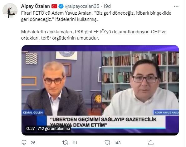 FETÖ elebaşısı Fetullah Gülen'in firari yeğeni Kemal Gülen'in Yotube yayınına katılan FETÖ firarisi Adem Yavuz Arslan, “Kurumlarımızı geri alacağız, arkadaşlarımızı geri toplayacağız. Tabiî ki biz eski mesleğimize devam edeceğiz” ifadeleri ile Türkiye’ye geri dönecekleri mesajını vermişti. CHP Genel Başkanı Kemal Kılıçdaroğlu’nun, KHK’lılar hakkındaki söylemlerden dolayı FETÖ’cülerin muhalefetten güç aldığını söyleyen AK Parti İzmir Milletvekili Alpay Özalan sosyal medya hesabından yaptığı paylaşımda, “Firari FETÖ'cü Adem Yavuz Arslan, ‘Biz geri döneceğiz, itibarlı bir şekilde geri döneceğiz’ ifadelerini kullanmış. Muhalefetin açıklamaları, PKK gibi FETÖ'yü de umutlandırıyor. CHP ve ortakları, terör örgütlerinin umududur” dedi.