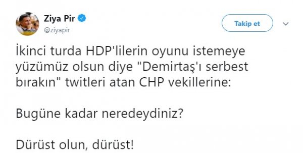 HDP Diyarbakır Milletvekili Ziya Pir, CHP'yi yüzsüzlükle suçlayarak "Demirtaş'ı serbest bırakın tweet'leri atan CHP'li vekillerine: Bugüne kadar neredeydiniz? Dürüst olun, dürüst!" ifadelerini kullandı.