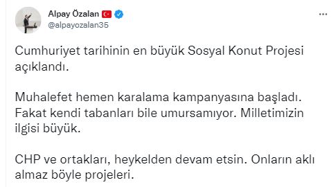AK Parti İzmir Milletvekili Alpay Özalan, “Cumhuriyet tarihinin en büyük Sosyal Konut Projesi açıklandı. Muhalefet hemen karalama kampanyasına başladı. Fakat kendi tabanları bile umursamıyor. Milletimizin ilgisi büyük. CHP ve ortakları, heykelden devam etsin. Onların aklı almaz böyle projeleri” dedi.