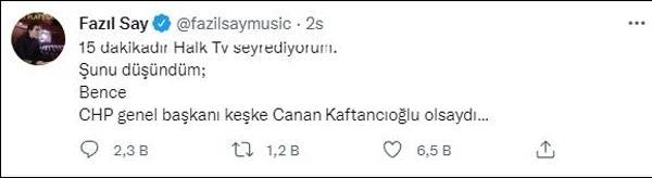 Twitter hesabından açıklama yapan Fazıl Say, "15 dakikadır Halk Tv seyrediyorum.Şunu düşündüm; Bence CHP genel başkanı keşke Canan Kaftancıoğlu olsaydı…" sözleriyle tepkisini dile getirdi.