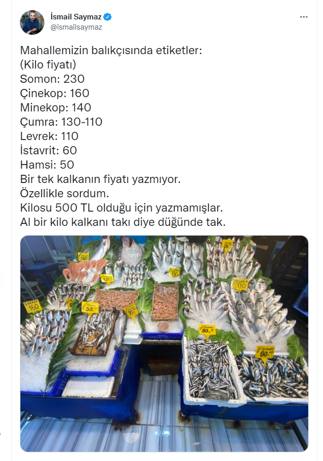 “Mahallemizin balıkçısında etiketler: (Kilo fiyatı) Somon: 230 Çinekop: 160 Minekop: 140 Çumra: 130-110 Levrek: 110 İstavrit: 60 Hamsi: 50 Bir tek kalkanın fiyatı yazmıyor. Özellikle sordum. Kilosu 500 TL olduğu için yazmamışlar. Al bir kilo kalkanı takı diye düğünde tak.”