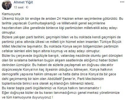 Yiğit açıklamasında, ''Konya'nın kaç ilçesinin olduğunu bilmeyen, Konya halkının demografik yapısına hakim olmayan ve hatta daha önce Konya'da bir gece dahi geçirmemiş bir isim olan Abdüllatif Şener'in, Parti Meclisimizin toplantısında birinci sıra olarak açıklandığını bilmenizi isteriz. Bu karar başta parti örgütlerimizi ve Konya halkını tanımamaktır'' ifadelerini kullandı.