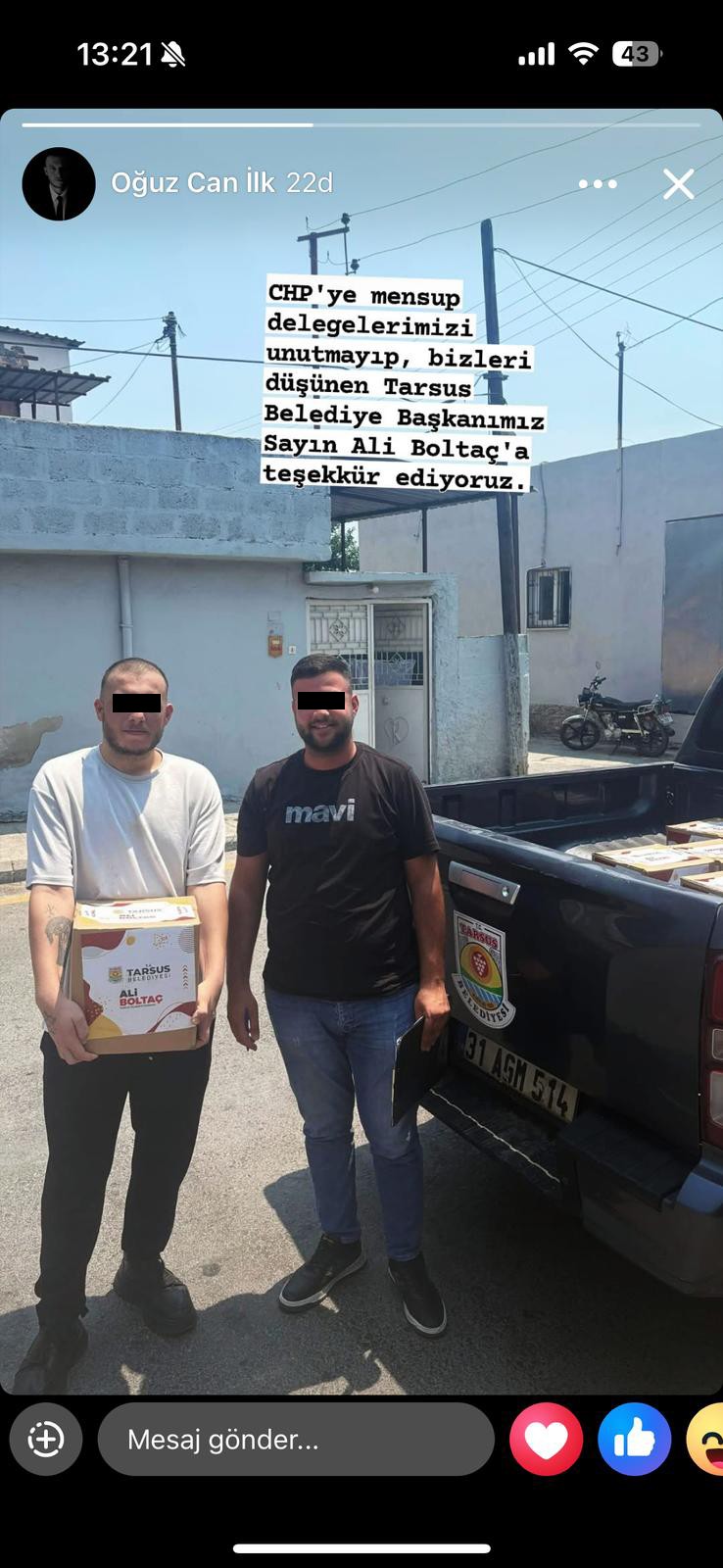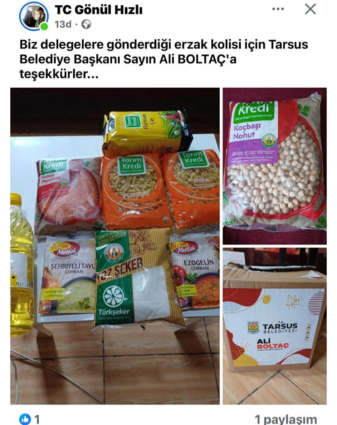 Öte yandan Başkanlığını CHP’li Ali Boltaç’ın yaptığı Mersin Tarsus Belediyesi’nin ise olağan kurultay öncesi delegelere gıda kolisi dağıtmaya başlaması dikkat çekti. Üzerinde Tarsus Belediyesi’nin logosu olan erzak kolilerini alan CHP delegeleri sosyal medyadan teşekkür mesajları paylaşırken, yaptıkları skandalı fark edilmesi üzerine kısa sürede paylaşımlarını kaldırması yaşanan rezaleti gözler önüne serdi.