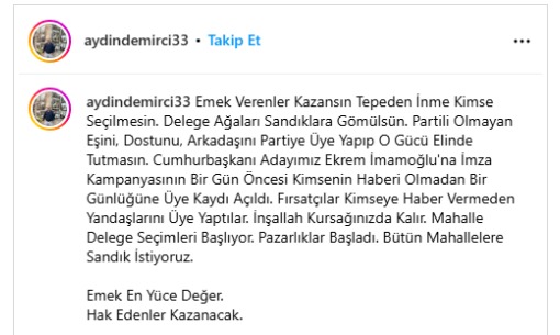 Mersin Akdeniz Belediyesi’nin CHP’li Meclis Üyesi Aydın Demirci, yolsuzluk zanlısı Ekrem İmamoğlu’nun Cumhurbaşkanı adayı olarak belirlenmesi için başlatılan imza kampanyası sırasında kimsenin haberi olmadan çok sayıda yandaşın gizlice üye yapıldığını öne sürdü. CHP’de olağan kurultay süreci mahalle delege seçimleriyle başlarken, partide dönen kirli dolapları ifşa eden Demirci sosyal medya hesabından yaptığı açıklamada, “Yandaşlar kimseye haber vermeden imza veren kendisine yakın isimleri partiye üye yaptı, delege pazarlıkları başladı!” diyerek olağan kurultay öncesinde patlak veren etik dışı uygulamalara dikkat çekti. Demirci, bu isimlerin partili olmayan ama yönetimle yakın ilişkileri bulunan eş, dost, akrabalar olduğunu iddia etti.
