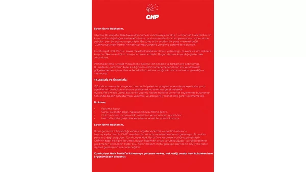 Mektupta, "İBB iddianamesinde adı geçen tüm parti üyelerinin, yargılama kesinleşinceye kadar parti üyeliklerinin derhal ve istisnasız şekilde askıya alınması gerekmektedir. Partimizde Genel Başkanlık yapmış kişilere hakaret ve nefret söyleminde bulunanlara disiplin soruşturması yapılmalıdır. Bu karar süreci siyasetin değil hukukun konusu haline getirir, CHP'nin kamu vicdanındaki sarsılmaz yerini yeniden güçlendirir, her türlü şaibe girişimine karşı kesin ve net bir yanıt oluşturur" ifadeleri yer aldı. Mektupta yolsuzluk sanığı İmamoğlu'nun partiden üstün tutulamayacağına vurgu yapılarak, "CHP'nin kişiler üzerine hiçbir kişi, hiçbir makam, hiçbir gerekçe, partimizin 102 yıllık temiz siyaset geleneğinin üzerinde değildir" denildi.