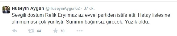 Olayı duyuran CHP'li Hüseyin Aygün, Twitter'de “Sevgili dostum Refik Eryılmaz az evvel partiden istifa etti. Hatay listesine alınmaması çok yanlıştı. Sanırım bağımsız girecek. Yazık oldu" mesajını paylaştı.