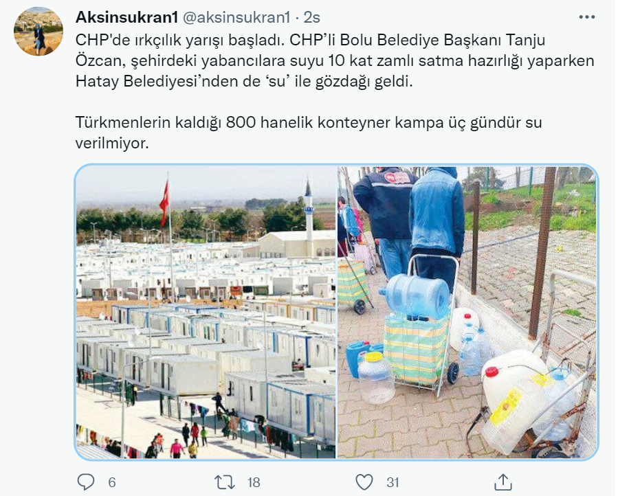 CHP’li Bolu Belediye Bşkanı Tanju Özcan’ın başlattığı mülteci karşıtlığına yeni bir halka daha eklendi. Sosyal medyada Hatay Belediyesi’nin Türkmenlerin kaldığı 800 hanelik konteyner kampa üç gündür su vermediği iddia edildi.