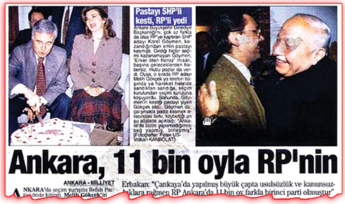 Ankara’yı AK Parti adayı Melih Gökçek’in kazanması da tarihi gerçekleri gündeme getirdi. 30 Mart yerel seçimlerinde Ankara’yı Melih Gökçek’in kazanmasına rağmen CHP adayı Mansur Yavaş havai fişekler atarak başkanlığını kutladı. Tarihte ise, 1994 yılındaki yerel seçimlerde Melih Gökçek bu sefer Refah Partisi’nden aday olmuştu. O dönem ki CHP, yani SHP’den ise Korel Göymen aday olmuştu. Seçimleri Melih Gökçek’in kazanmasına rağmen Korel Göymen pasta keserek, başkanlığını kutlamıştı. 30 Mart 1994 yılında Milliyet’in haberinde bu olay şu başlıkla verilmişti: “Pastayı SHP’li kesti, RP’li yedi.”