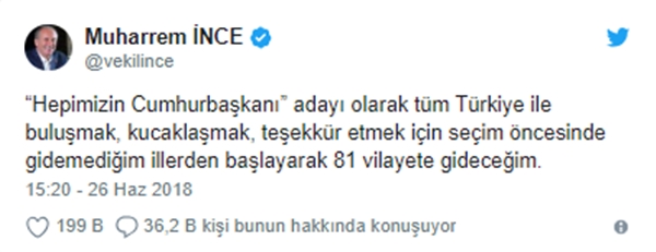 Muharrem İnce, twitter hesabı üzerinden yaptığı paylaşımda, "Hepimizin Cumhurbaşkanı” adayı olarak tüm Türkiye ile buluşmak, kucaklaşmak, teşekkür etmek için seçim öncesinde gidemediğim illerden başlayarak 81 vilayete gideceğim" ifadelerini kullandı.