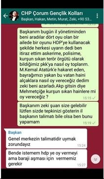 Buna son örnek CHP Çorum Gençlik Kolları’nın WhatsApp gurubunda kendini gösterdi. CHP Çorum Gençlik Kolları’nın başkana yazılan mesajda Genel Merkez talimatıyla “4 oyu olan aileden 1 oyun HDP’ye atılması” talebine büyük tepki gösterildi: Başkanım bugün il yönetiminden beni aradılar. Dört oyu olan bir ailede bir oyunu HDP’ye kullanacak şekilde herkesi uyarın dedi. Askerime, polisime kurşun sıkan terör örgütü olarak bildiğimiz PKK’ya nasıl oy toplarım. Mustafa Kemal Atatürk’e hakaret eden, bayrağımızı yakan bu vatan haini alçaklara nasıl oy vereceğiz dedim. Zeki beni azarladı. AK Parti gitsin diye Mehmetçiğe kurşun sıkan hainlere mi oy vereceğiz? Zeki size gelebilir lütfen tepkinizi gösterin. İl başkanın talimatı bile olsa ben bunu yapamam.