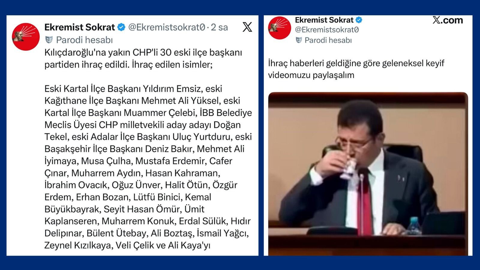 "Partimiz rüşvet ve yolsuzluktan arınmalı" şeklinde bildiri yayımlayan 30 CHP'li eski ilçe başkanı ihraç edildi. Kararı CHP Genel Merkezi değil ilk olarak partiyi vesayet altında tutan İmamoğlu’nun troll hesaplarının duyurduğu ortaya çıktı.