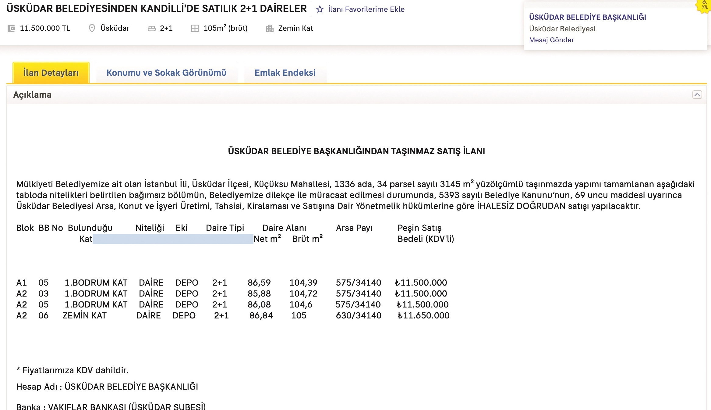 Öte yandan CHP’li Üsküdar Belediyesi, Küçüksu Mahallesi, 1336 ada, 34 parsel de bulunan 4 adet daire niteliğindeki taşınmazı sarı sitelerde ilana çıkarak satışa sundu. 2+1 tipindeki ve ortalama net 85 m2 ebatında olan daireyi toplamda 46 milyon 150 bin TL’ye haraç mezat satacak.
