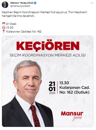 Yavaş sosyal medya hesabından yaptığı açıklamada "Keçiören Seçim Koordinasyon Merkezi'mizi açıyoruz. Tüm Keçiörenli hemşehrilerimiz davetlidir" dedi.