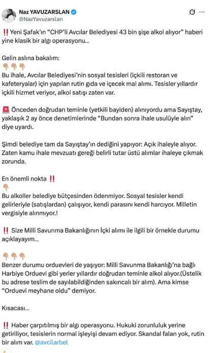 Avcılar Belediyesi’nin yerel kaynakları halkın asıl ihtiyaçlarına harcamak yerine on binlerce şişe alkol alımına ayırması infiale neden olurken, CHP kanadı bu skandalı "milli savunma bakanlığı da alıyor" diyerek meşrulaştırmaya kalkıştı. Kalender Orduevi’nin geçmiş tarihli "doğrudan temin" belgelerini öne sürerek kendi ayıplarını örtmeye çalışan zihniyete milletten tepki gecikmedi: "Biri yanlış yapıyorsa diğeri de mi yapmalı?"