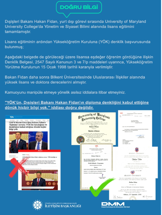 "YÖK'ün, Dışişleri Bakanı Hakan Fidan'ın diploma denkliğini kabul ettiğine dönük hiçbir bilgi yok." iddiası doğru değildir.