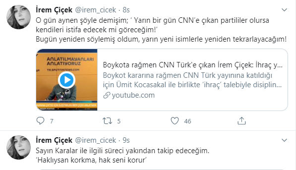 Cumhuriyet Halk Partisi yönetimi, 3 Şubat'ta aldığı boykot kararına uymadığı gerekçesi ile CNN Türk'te canlı yayına katılan Ümit Kocasakal ve Mehmet Sevigen'den sonra İrem Çiçek hakkında da ihraç süreci başlatmıştı.