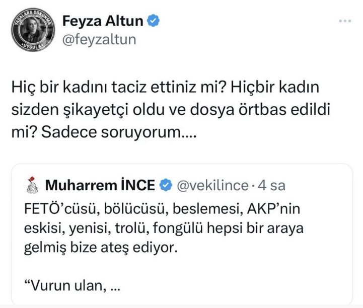İnce'nin "FETÖ’cüsü, bölücüsü, beslemesi, AKP’nin eskisi, yenisi, trolü, fongülü hepsi bir araya gelmiş bize ateş ediyor" paylaşımını alıntılayan Feyza Altun, "Hiç bir kadını taciz ettiniz mi? Hiçbir kadın sizden şikayetçi oldu ve dosya örtbas edildi mi? Sadece soruyorum…" ifadelerini kullandı.