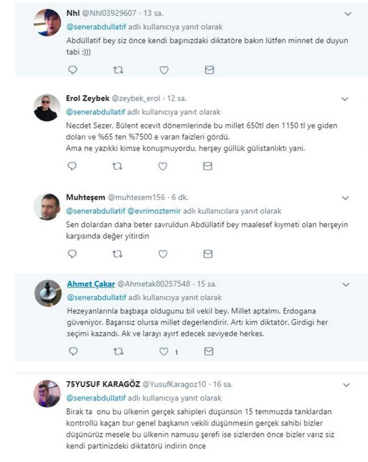 Kur artışıyla ilgili hükümeti ve Cumhurbaşkanı Recep Tayyip Erdoğan'ı suçlayıcı ifadeler kullanan Şener yine her zamanki gibi Erdoğan'a saldırınca ağzının payını aldı. Şener'e Twitter'dan bazı kullanıcılar tepki gösterdi. Bir kullanıcı ''Abdullatif Bey siz önce kendi başınızdaki diktatöre bakın lütfen minnet de duyun'' diyerek tepki gösterdi.