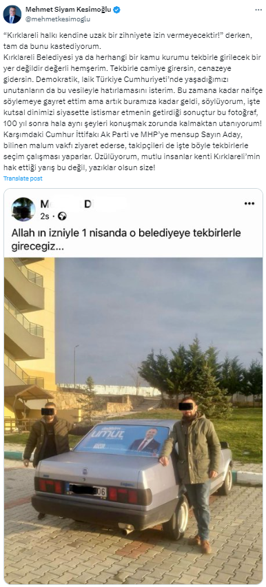 Parti tabanı tarafından istenilmemesine rağmen 'yapay zeka' tarafından aday gösterilen mevcut Kırklareli Belediye Başkanı CHP'li Mehmet Siyam Kesimoğlu, tekbirden hazımsız oldu. "Allah'ın izniyle 1 Nisan'da belediyeye tekbirlerle gireceğiz" diyen bir vatandaşın paylaşımı üzerinden İslami değerlere beslediği kini gün yüzüne çıkaran Kesimoğlu "Kırklareli Belediyesi ya da herhangi bir kamu kurumu tekbirle girilecek bir yer değildir, 100 yıl sonra hala aynı şeyleri konuşmak zorunda kalmaktan utanıyorum!" şeklinde laf salatası yaptı.