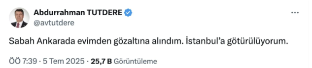 Tutdere, “Sabah Ankara'da evimden gözaltına alındım. İstanbul’a götürülüyorum” açıklamasını yaptı.