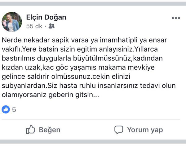 yeniakit.com.tr İsmail Uğur Cinsel istismar ve sapıklık konusunda aynaya bakmayan CHP zihniyeti, yavuz hırsız misali sürekli dindarlara iftiralar atıyor. CHP’li bir sapığın metrobüste bir kadına yönelik tacizini görmezden gelen CHP’li Samsun Atakum Belediyesinin Özel Kalem Sekreteri Elçin Doğan, sosyal medya hesabından paylaştığı gönderide yine Müslümanları hedef aldı. Doğan paylaştığı mesajda, “Nerde ne kadar sapık varsa ya İmam Hatipli ya Ensar Vakıflı. Yere batsın sizin eğitim anlayışınız. Yıllarca bastırılmış duygularla büyütülmüşsünüz, kadından kızdan uzak, kaç göç yaşamış, makama mevkiye gelince saldırır olmuşsunuz. Çekin elinizi sübyanlardan. Siz hasta ruhlu insanlarsınız, tedavi olun, olamıyorsanız geberin gitsin.” diyerek Müslümanlara kin ve nefret kustu.