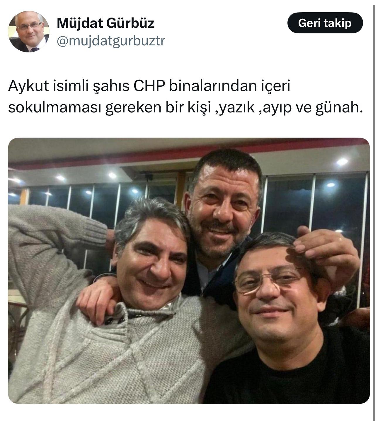 CHP Gaziosmanpaşa eski İlçe Başkanı Müjdat Gürbüz; Özgür Özel, Veli Ağbaba ile gözaltına alınan Aykut Erdoğdu’nun birlikte fotoğrafını paylaşarak, “Aykut isimli şahıs CHP binalarından içeri sokulmaması gereken bir kişi. Yazık, ayıp ve günah” diyerek tepki gösterdi.