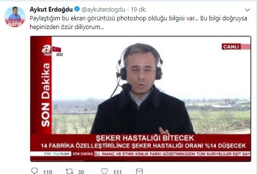 Daha sonra paylaşımın grafik tasarım programı Photoshop’la yapıldığı bilgisini alan Aykut Erdoğdu Twitter’dan özür diledi.