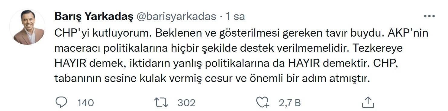 CHP’yi kutluyorum. Beklenen ve gösterilmesi gereken tavır buydu. AKP’nin maceracı politikalarına hiçbir şekilde destek verilmemelidir. Tezkereye HAYIR demek, iktidarın yanlış politikalarına da HAYIR demektir. CHP, tabanının sesine kulak vermiş cesur ve önemli bir adım atmıştır.