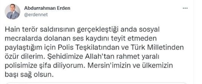 "Hain terör saldırısının gerçekleştiği anda sosyal mecralarda dolanan ses kaydını teyit etmeden paylaştığım için Polis Teşkilatından ve Türk Milletinden özür dilerim. Şehidimize Allah'tan rahmet yaralı polisimize şifa diliyorum. Mersin'imizin ve ülkemizin başı sağ olsun."