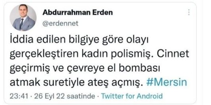CHP Akdeniz Gençlik Kolları Başkanı Abdurrahman Erden, terör örgütü PKK mensubu iki teröristin Mersin'in Mezitli ilçesindeki polis evine yönelik gerçekleştirdiği alçak saldırı hakkında sosyal medya hesabından dezenformasyon yaptı. Erden, saldırının bir kadın polisin cinnet geçirmesi sonucu yaşandığını yazdı. Erden daha sonra hain terör saldırısının gerçekleştiği anda sosyal mecralarda dolanan ses kaydını teyit etmeden paylaştığını iddia ederek özür diledi.