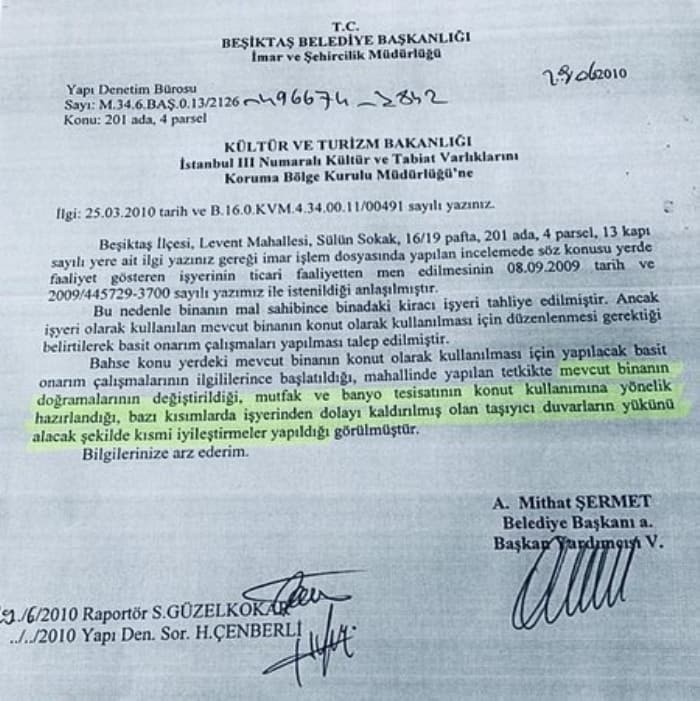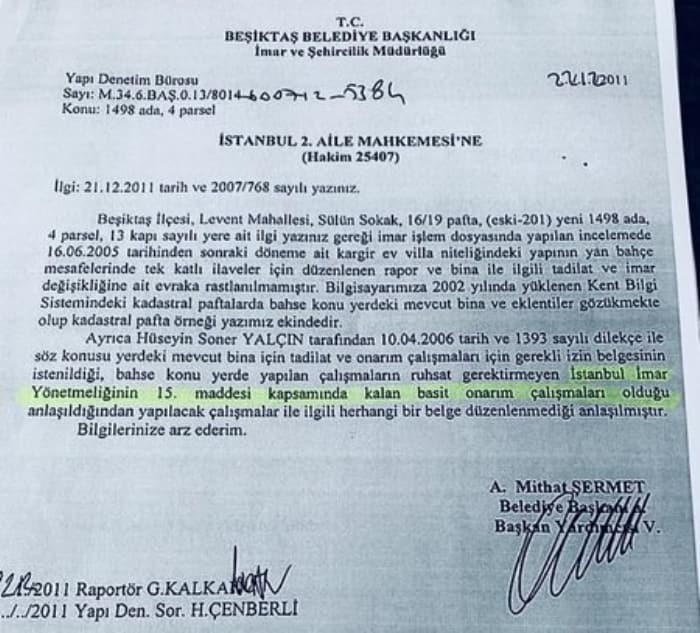Yalçın'ın, Çeşme'de SİT alanındaki kaçak yapılaşmaya gittiği villasından sonra İstanbul'un göbeği, Beşiktaş'ın Levent Mahallesi'ndeki villasında da usulsüz inşaat yaptığı ortaya çıktı. Sabah Özel İstihbarat Bölümü'nün ulaştığı belgelere göre; Yalçın 2005'te daha önce bir şirket tarafından kullanılan tripleks villa aldı. Yalçın evde basit tadilat yapmak bahanesiyle SİT alanında kalan villasında basit tadilat adı altında usulsüz inşaat çalışması yaptı.