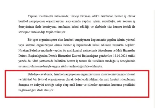 Şartnamede yer alan "Yöresel, kültürel festival organizasyonları düzenlemiş olmak" kriterine karşın ihaleyi kazanan istekli tarafından benzer iş olarak, hentbol şampiyonası organizasyonu kapsamında yapılan işlerin sunulduğu tespitine yer verilen Sayıştay raporunda, "Bir spor organizasyonu olan hentbol şampiyonası kapsamında yapılan işlerin, yöresel veya kültürel organizasyon olarak benzer iş kapsamında kabul edilmesi mümkün değildir" denildi.