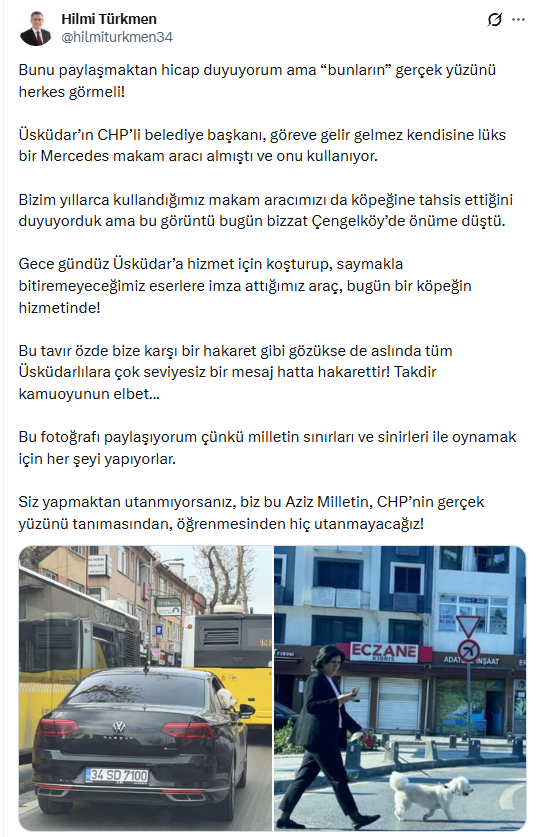 Eski Başkan Türkmen'in iddiasına göre, CHP’li belediye başkanı göreve gelir gelmez kendisine lüks bir Mercedes makam aracı satın aldı. Ancak asıl skandal, yıllarca Üsküdar halkına hizmet için kullanılan önceki makam aracının akıbeti oldu. Türkmen'in paylaştığı görselde, bu aracın bir köpeğe tahsis edilmiş olduğu görüldü.