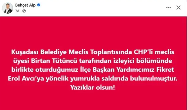 “Kuşadası Belediye Meclis Toplantısında CHP'li meclis üyesi Birtan Tütüncü tarafından, izleyici bölümünde birlikte oturduğumuz İlçe Başkan Yardımcımız Fikret Erol Avcı'ya yumrukla saldırıda bulunulmuştur. Yazıklar olsun!”