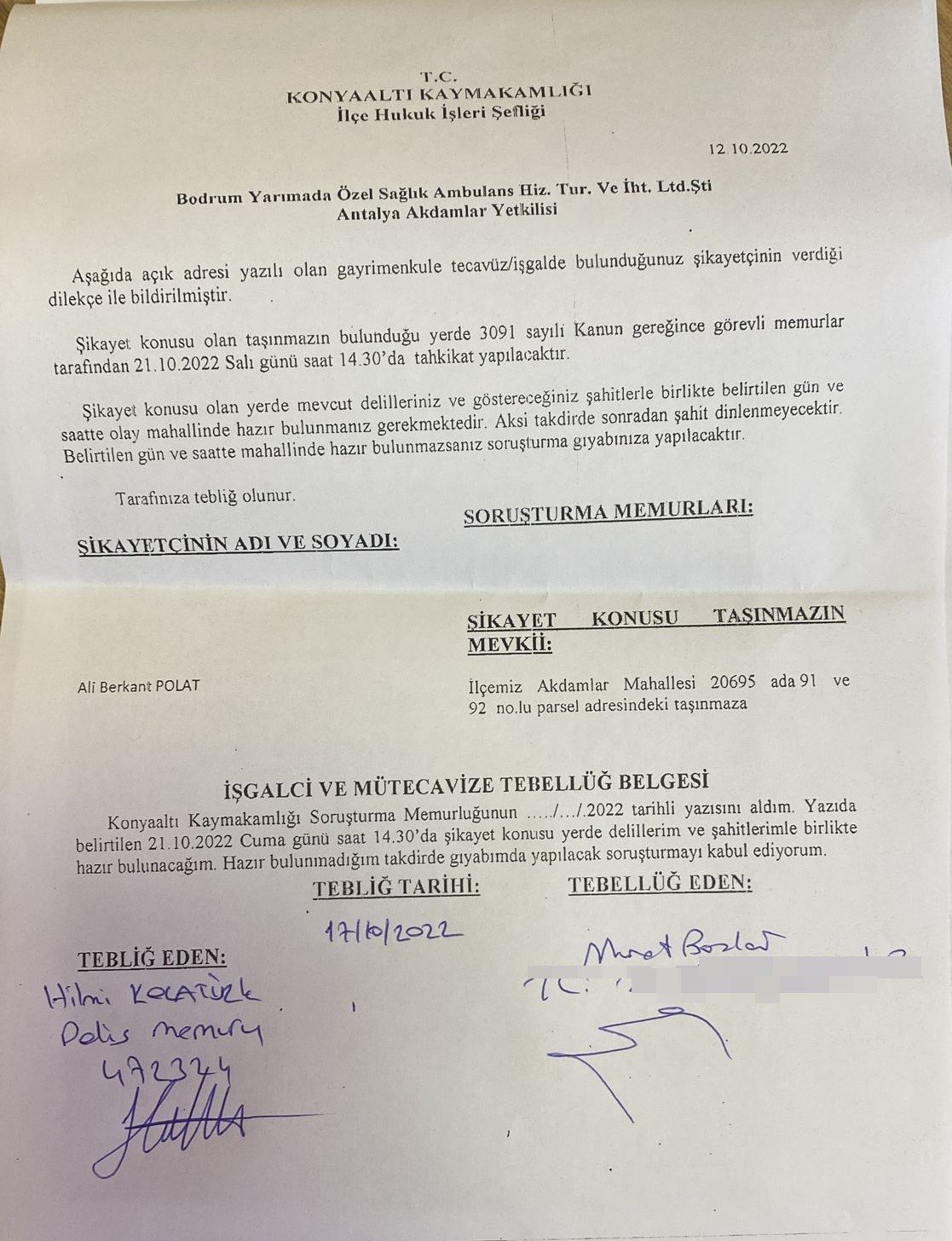 “Öylesine pervasızca, korkusuzca davranıldı ki kaçak yapı ve su aboneliğinden sonra bu villaya belediyenin araçları tarafından yol açma çalışması başlatıldı. Üstelik bu yol tel örgülerimiz kırılarak ve malımıza zarar verilerek arazimizin içinden geçirildi. Konyaltı Belediyesi iş makineleri yardımıyla 7 metre eninde 170 metre uzunluğunda stabilize yol yapıldı.
