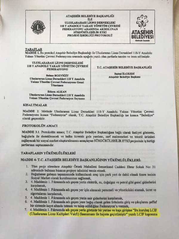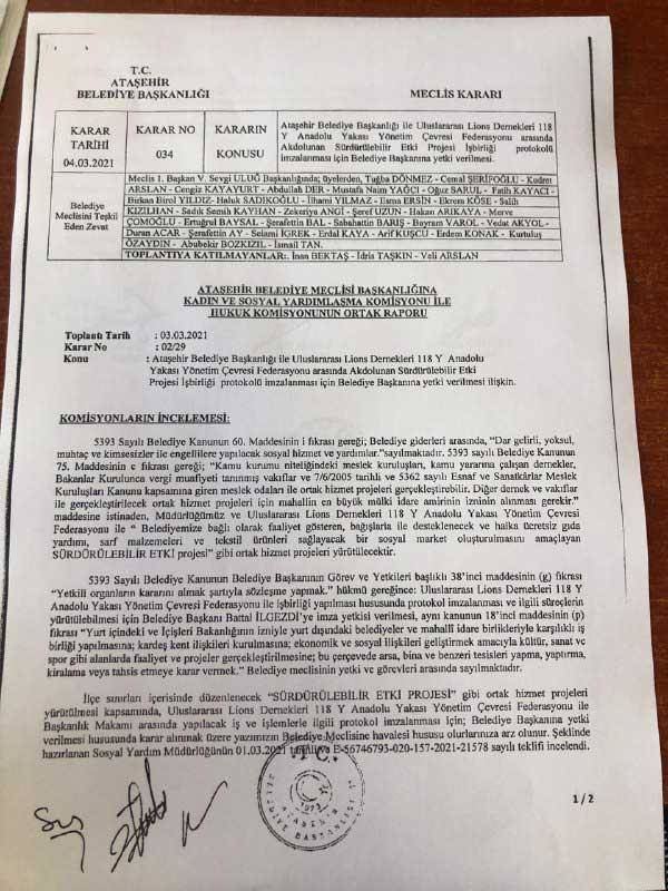 Ataşehir Belediyesi'nin aldığı meclis kararında, "5393 Sayılı Belediye Kanunu'nun 60. Maddesinin 1. Fıkrası gereği; Belediye giderleri arasında 'dar gelirli, yoksul, muhtaç ve kimsesizler ile engellilere yapılacak sosyal hizmet ve yardımlar' sayılmaktadır. 5393 Sayılı Belediye Kanunu'nun 75. maddesinin e fıkrası gereği; Kamu kurumu niteliğindeki meslek kuruluşları, kamu yararına çalışan dernekler, Bakanlar Kurulunda vergi muafiyeti tanınmış vakıflar ve 7 Haziran 2005 tarihli ve 5362 sayılı Esnaf ve Sanatkarlar Meslek Kuruluşları Kanunu kapsamına giren meslek odaları ile ortak hizmet projeleri gerçekleştirebilir. Diğer dernek ve vakıflar ile gerçekleştirilecek ortak hizmet projeleri için mahallin en büyük mülki idare amirinin izninin alınması gerekir.'' maddesine istinaden, Müdürlüğümüz ve Uluslararası Lions Dernekleri 118 Y Anadolu Yakası Yönetim Çevresi Federasyonu ile ''Belediyemize bağlı olarak faaliyet gösteren, bağışlarla desteklenecek ve halka ücretsiz gıda yardımı, sarf malzemeleri ve tekstil ürünleri sağlayacak bir sosyal market oluşturulmasını amaçlayan sürdürülebilir etki projesi gibi ortak hizmet projeleri yürütülecektir." ifadeleri yer aldı.