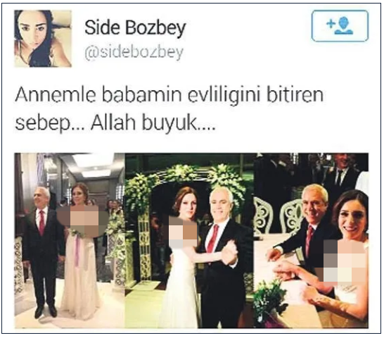 Bu evliliğe en dikkat çekici tepki, Başkan Mustafa Bozbey'in ilk eşinden olan kızı Side Bozbey Gürer'den geldi. Babasıyla birlikte son operasyonlarda adı geçen Side Bozbey, yıllar önce sosyal medya üzerinden yaptığı paylaşımda annesiyle babasının düğün fotoğrafını paylaşarak şu ifadeleri kullanmıştı: