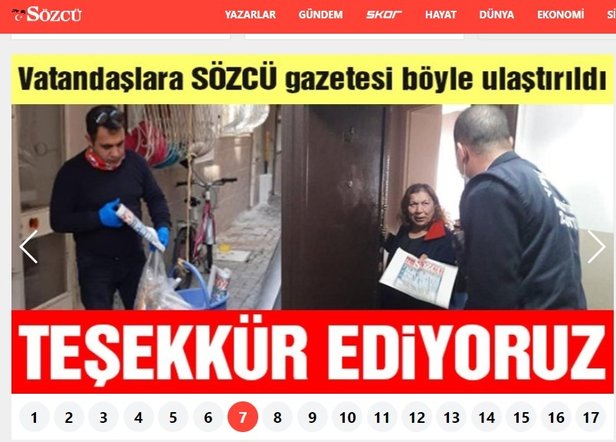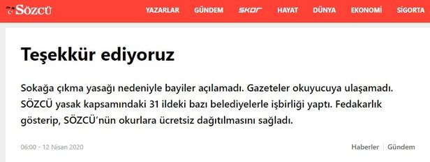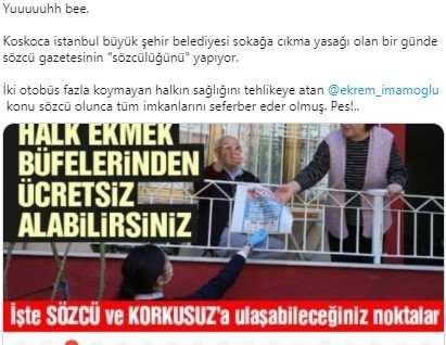 Koronavirüs salgını nedeniyle alınan tedbirler kapsamında hafta sonunu kapsayacak şekilde 30 büyükşehir ve Zonguldak'ta "sokağa çıkma yasağı" ilan edilirken, CHP'li belediyeler halka hizmet yerine Sözcü paçavrasının posta memurluğuna soyundu. Kapı kapı gezerek Sözcü paçavrasını dağıtan CHP'li belediyelere tepki yağarken, sözde gazete internet sitesi üzerinden açık açık bu yandaşlığı kabullenerek belediyelere teşekkür etti.