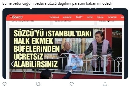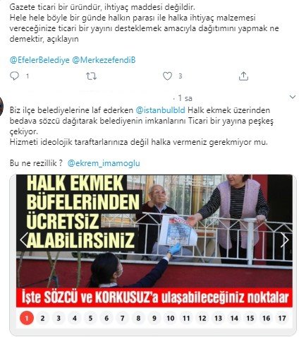 Belediye ekmeği satış noktalarında ve kapı kapı gezilerek Sözcü Gazetesi'nin dağıtılması sonrası, Sözcü pervasızlıkta sınır tanımayarak adeta posta memurluğunu yapan CHP'li belediyelere teşekkür etti.