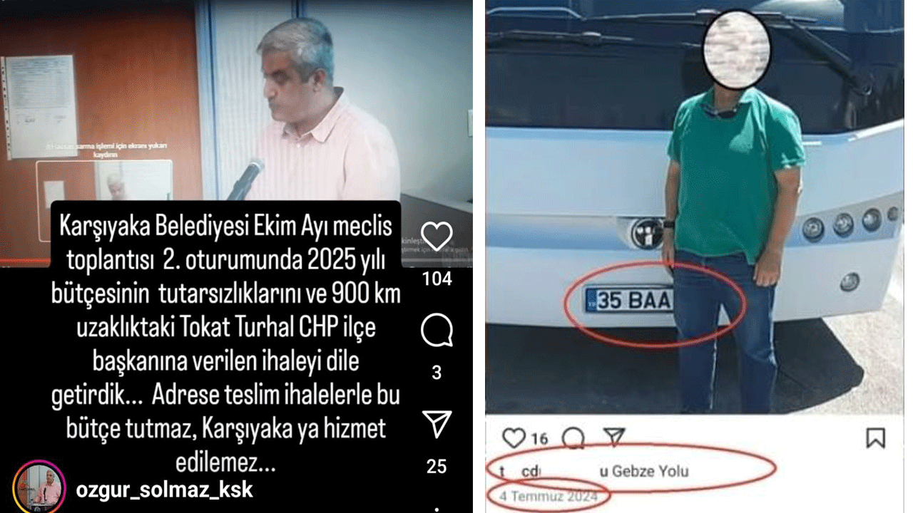 İzmir'de 10 civarında sanayi sitesi olmasına rağmen Belediye'nin araçlarının bakımında kullanılmak üzere yağ, filtre ve lastik alımının da ilçeye 900 kilometre uzaklıktaki Tokat ilinden yapıldığını kaydeden Solmaz, ihalenin verildiği firmanın sahibinin CHP Turhal ilçe başkanı olduğunu ekledi.
