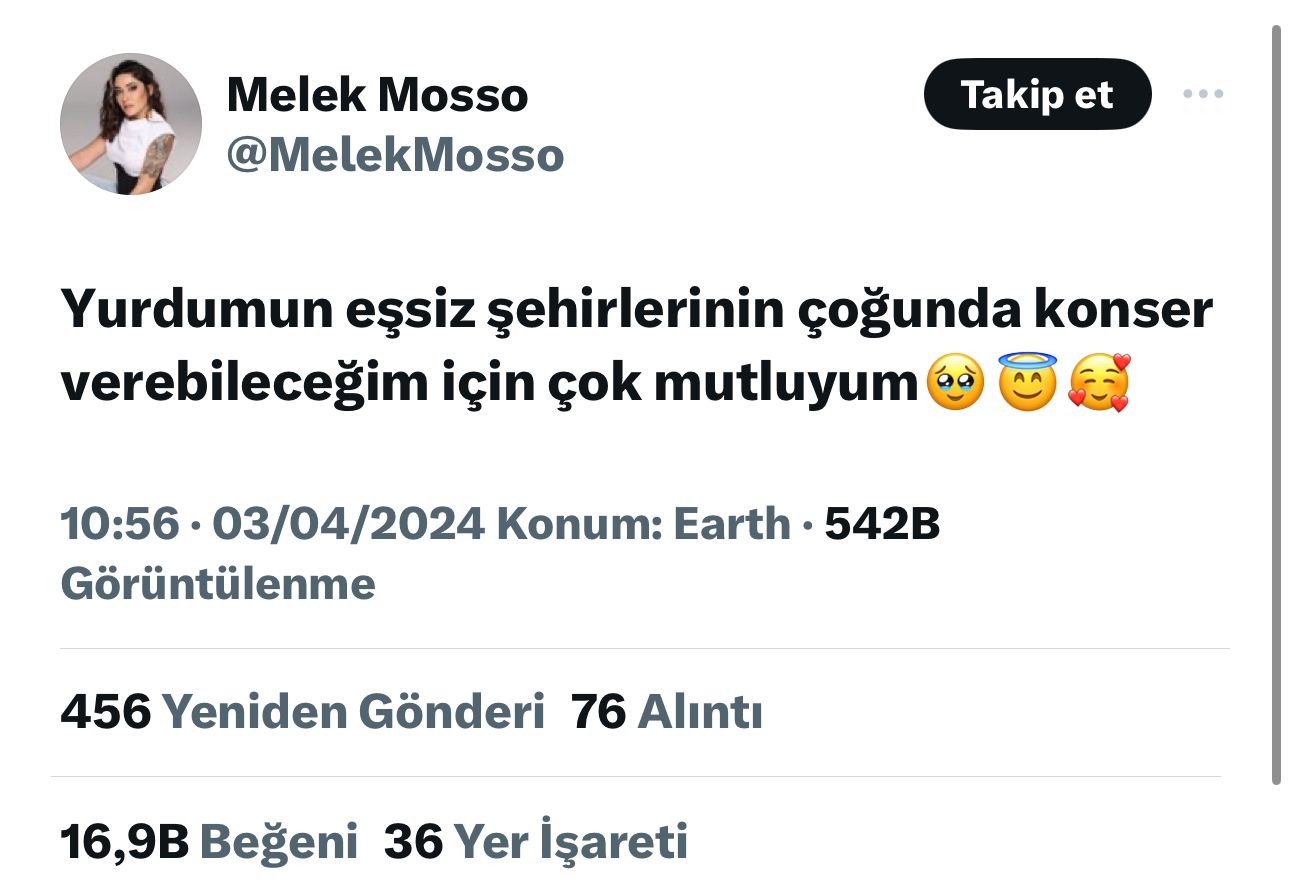 Seçim sonuçlarına ilişkin yorumda bulunan Melek Mosso CHP’nin kazandığı illerde konser vermek için mutlu olduğunu belirtti. Sosyal medya platformu X’te sevinç paylaşımları yapan Mosso, “Yurdumun eşsiz şehirlerinin çoğunda konser verebileceğim için çok mutluyum” ifadelerini kullandı.