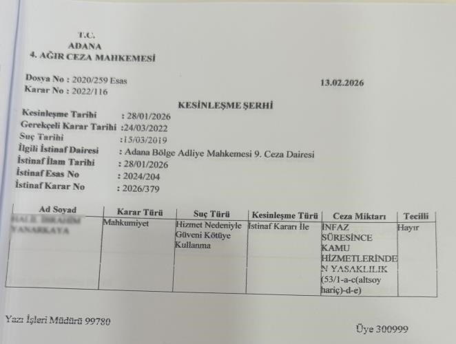 Mahkeme, 'hizmet nedeniyle güveni kötüye kullanma' suçundan 2022 yılında 1 yıl 8 ay hapis ve 5 bin lira adli para cezası verdi. H.İ.Y., karara itiraz etti ancak Adana Bölge Adliye Mahkemesi 9.Ceza Dairesi, kararı onadı.
