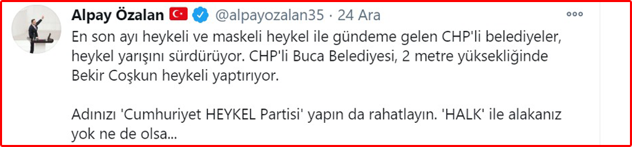 Özalan Twitter hesabından yaptığı paylaşımda, “En son ayı heykeli ve maskeli heykel ile gündeme gelen CHP’li belediyeler, heykel yarışını sürdürüyor. CHP’li Buca Belediyesi, 2 metre yüksekliğinde Bekir Coşkun heykeli yaptırıyor. Adınızı ‘Cumhuriyet Heykel Partisi’ yapın da rahatlayın. ‘Halk’ ile alakanız yok ne de olsa… ” ifadelerini kullandı.